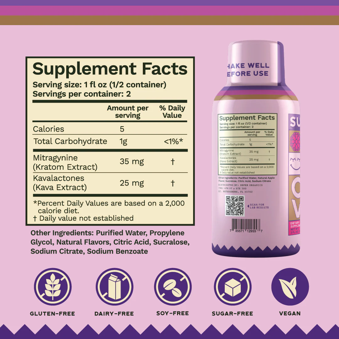 Promotes rapid relaxation, soothes body & mind, and offers a tension-free, social energy. Powered by premium botanical extracts, Chill Vibes has 35 mg mitragynine & 25 mg kavalactones per serving for maximum benefits. Apple flavor. 2 servings in a bottle.